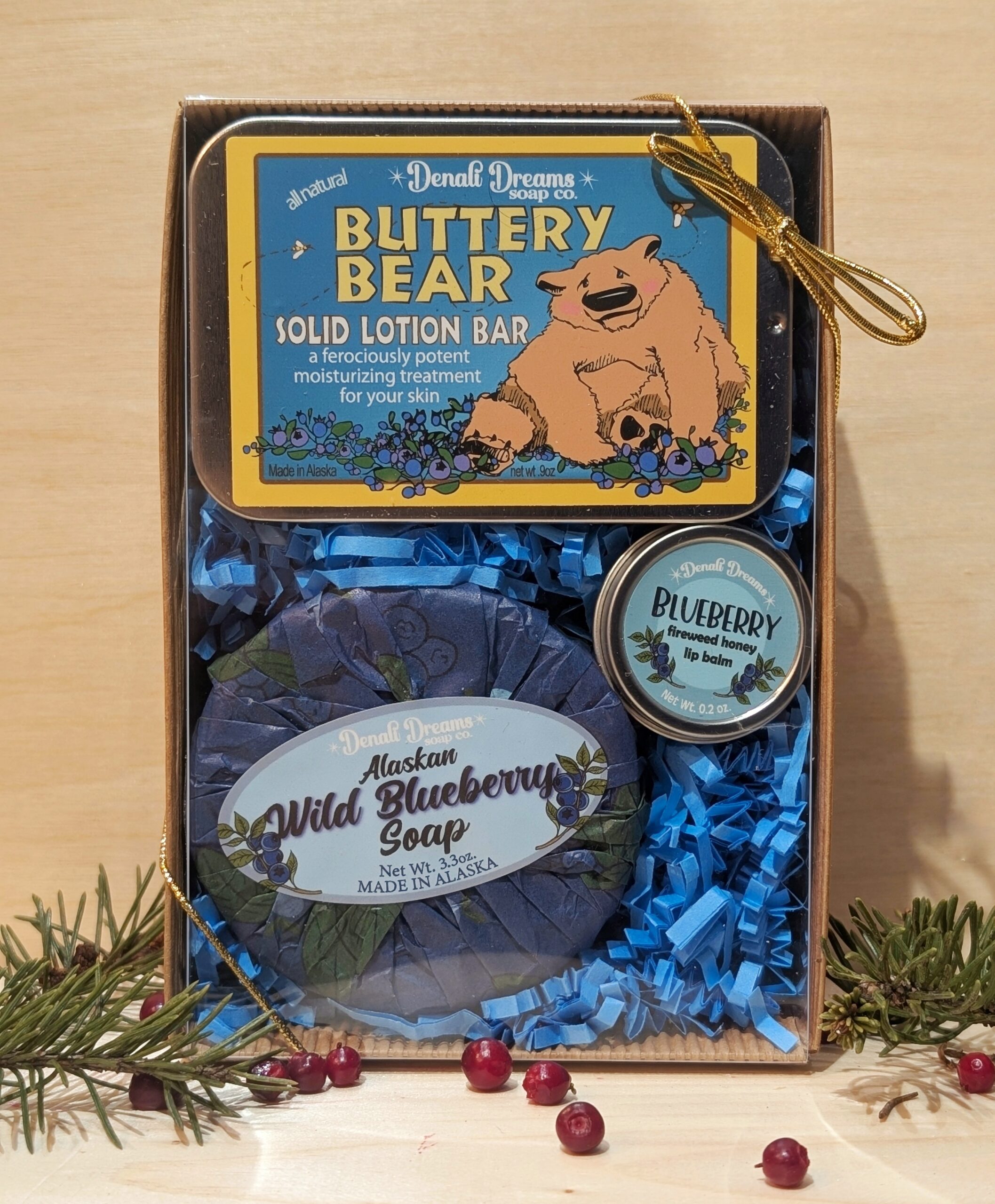 A gift box filled with either a Blueberry or Cranberry Soap, a Buttery Bear Solid Lotion Bar, and a matching Fireweed Honey Lip Balm